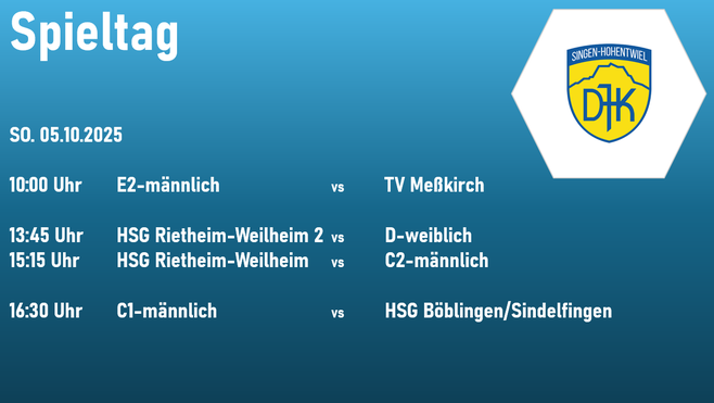 Neben den Herren 1 und den Frauen, sind auch die Teams der B-männlich, D-weiblich, sowie der C2-männlich in Rietheim-Weilheim zu Gast. Die D1-Jungs sind beim Rückspiel gegen die SG Allensbach/Dettingen gefordert.