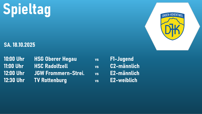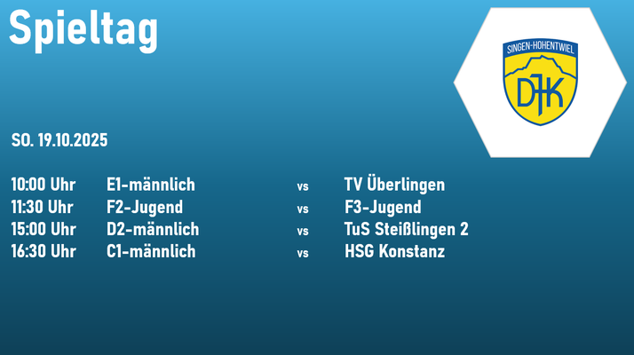 Am Sonntag empfängt die E1-männlich den TV Überlingen zum ersten Heimspiel. Anschließend trifft beim 4+1-Spieltag die F2- auf die F3-Jugend, bevor die D2-männlich gegen den TuS Steißlingen 2 spielt.